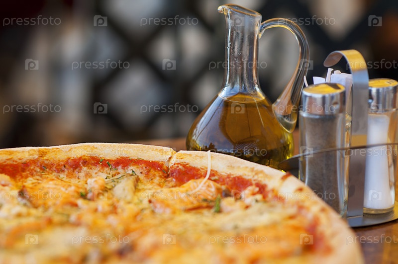 Пицца и оливковое масло на столике ресторана