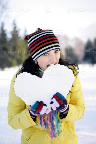 Девушка кусает снег в форме сердца
