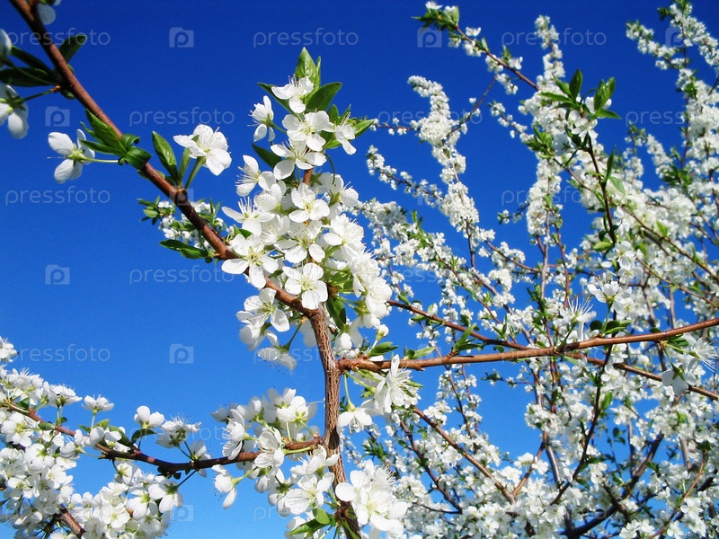 Цветущие ветки сливы на фоне синего неба