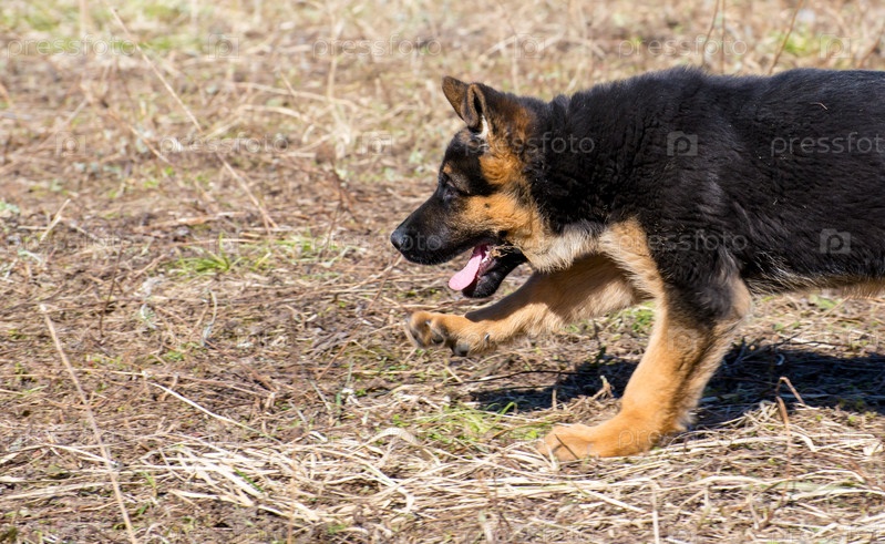 Щенок немецкой овчарки бегает и играет