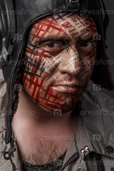 Забавный камуфляж военного стиля на лице танкиста