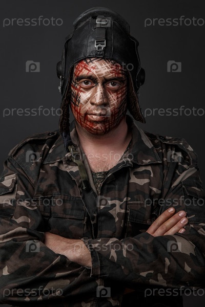 Забавный камуфляж военного стиля на лице танкиста