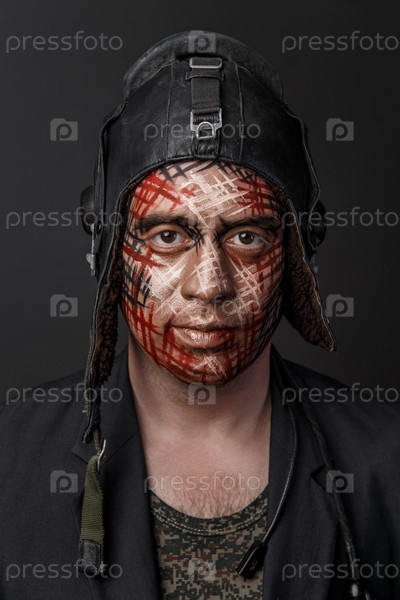 Забавный камуфляж военного стиля на лице танкиста