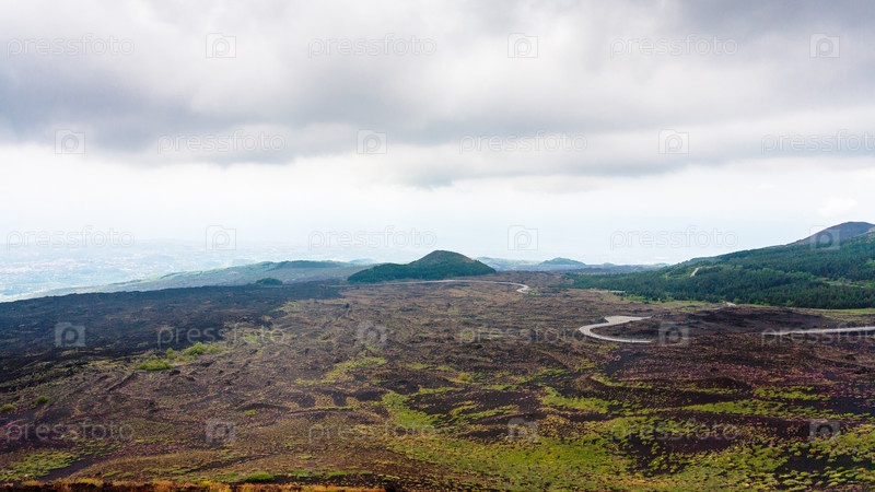 Облачное небо над полями лавы на горе Этна