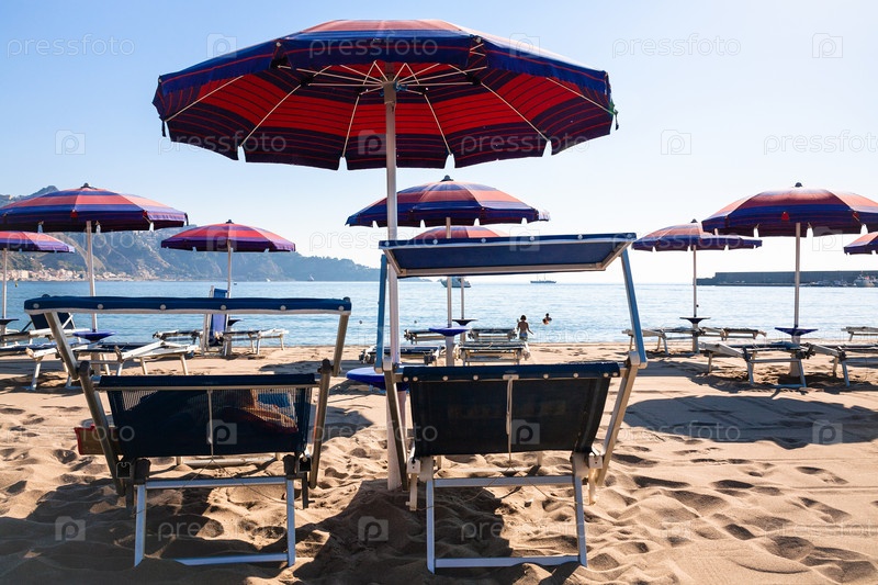 Стулья на городском пляже в городе Джардини Наксос