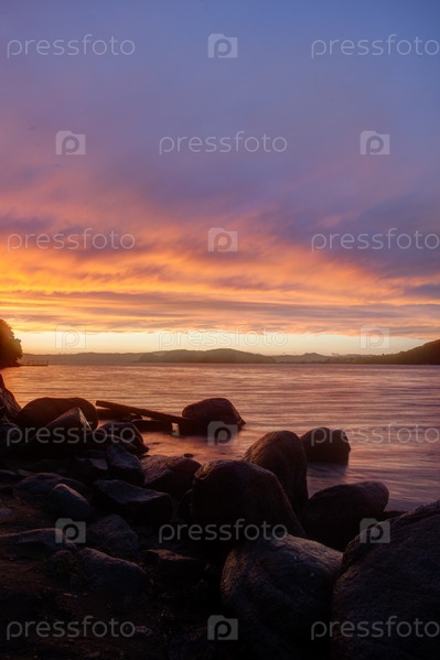 Драматические закатные небеса в морском заливе