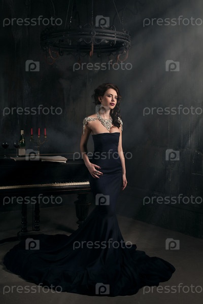 Красивая молодая женщина в черном платье рядом