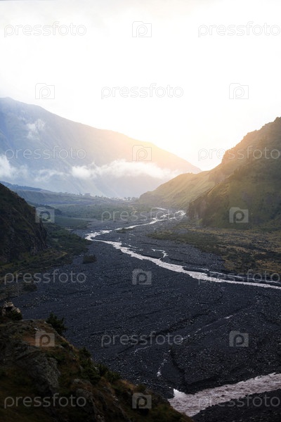 Горная река среди черного каменного берега. Грузия