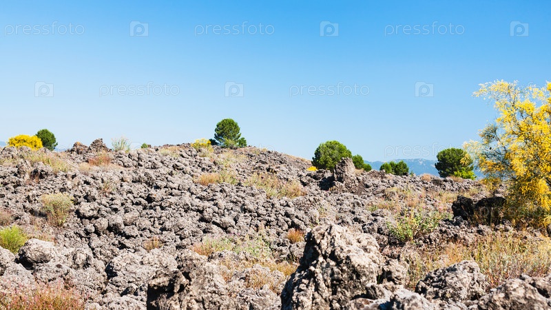 Кусты на окаменелых лавовых потоках после извержения вулкана Этна