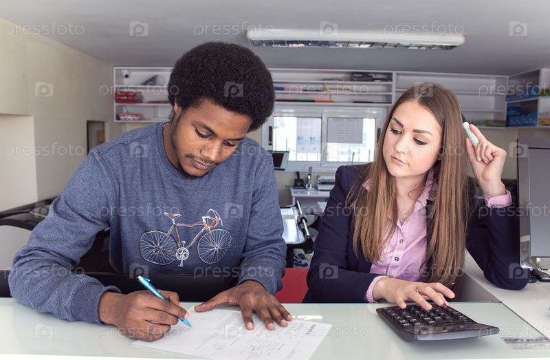 Молодая красивая женщина и мужчина в офисе