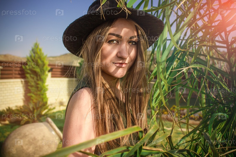 Молодая красивая девушка в черной шляпе