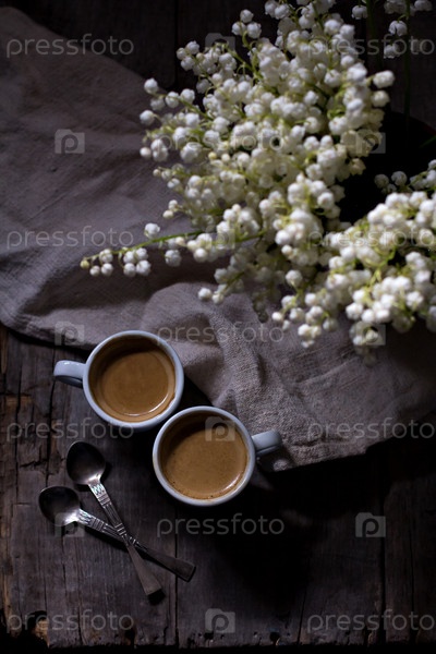 Две чашки эспрессо и ландыши