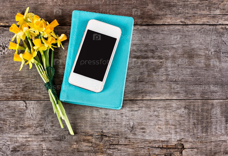Желтые нарциссы, блокнот и мобильный телефон
