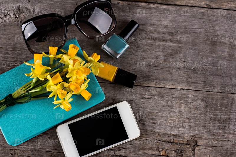 Желтые нарциссы, ноутбук, лак для ногтей и сотовый телефон