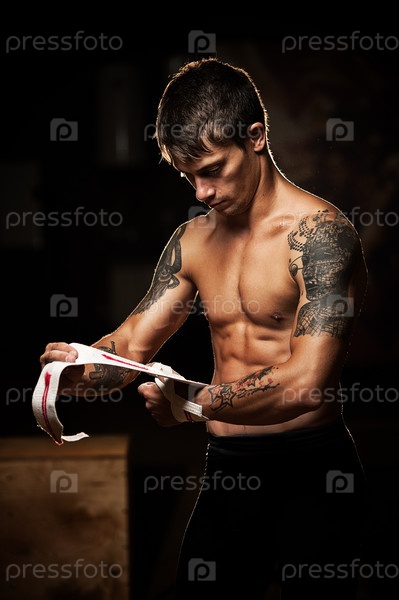 Молодой мужчина-спортсмен делает повязку перед тренировкой