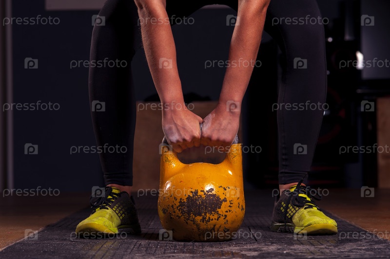 Женщина-спортсменка готовится к тренировке с гирей