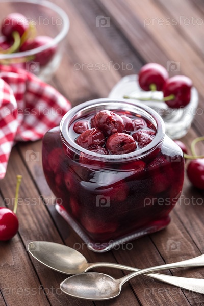 Ягоды вишни с сиропом в стеклянной банке. Консервированные фрукты