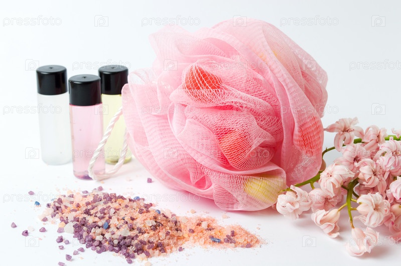 Губка для ванны и соль с розовыми цветами