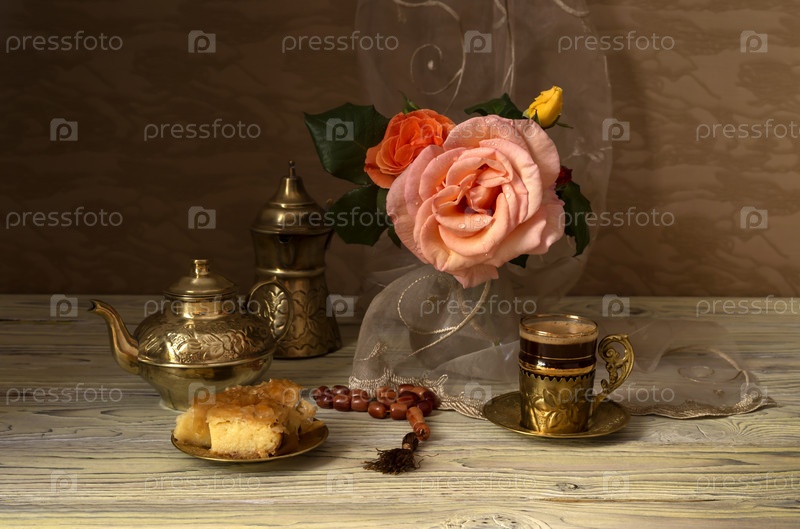 Натюрморт с весенними розами и кофе