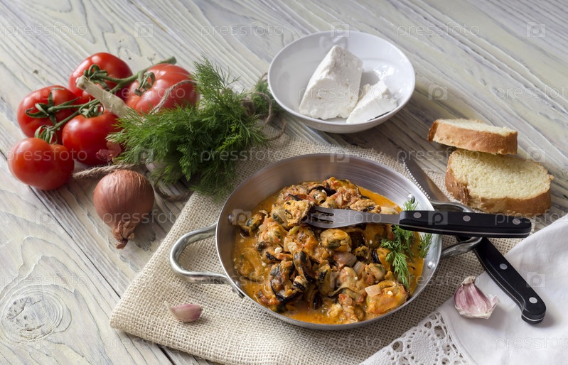 Мидии тушеные с сыром фета и овощами