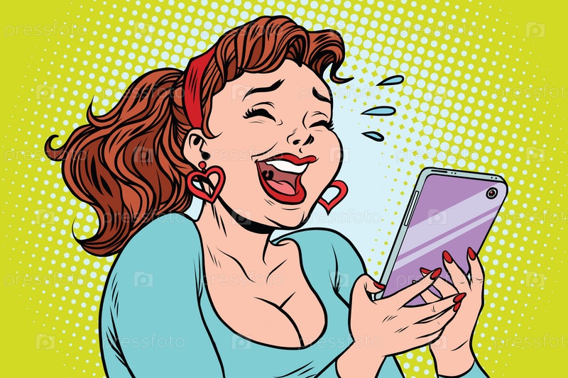Девушка смеется до слез читая смартфон