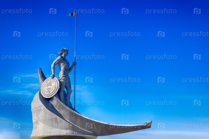 Скульптура мужчины-воина в лодке на фоне неба