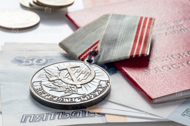 Медаль ветерана труда, пенсионное удостоверение и деньги