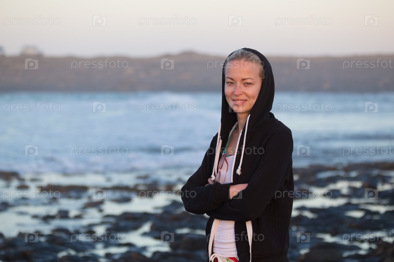 Спортивная женщина на песчаном пляже в сумерках