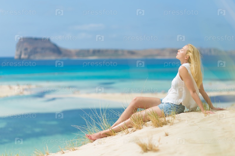 Счастливая женщина, наслаждаясь солнцем на каникулах