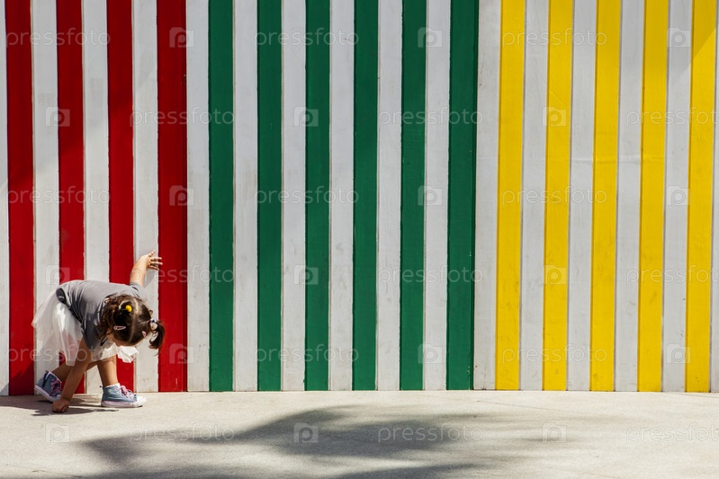 Играя рядом с полосатой цветной стеной