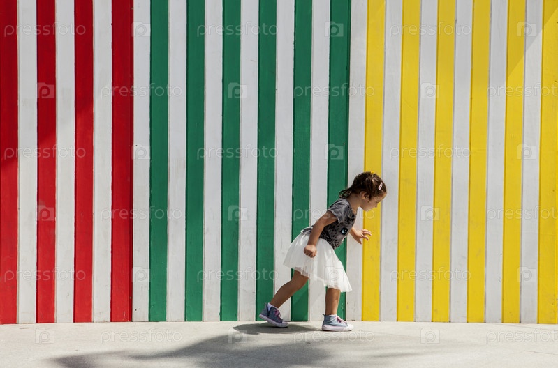 Играя рядом с полосатой цветной стеной