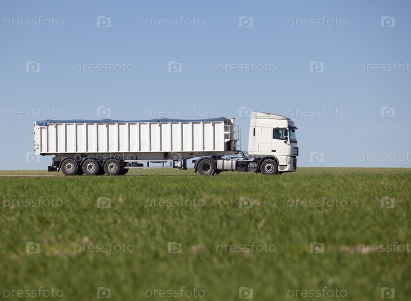Проезжающий грузовик на зеленом сельскохозяйственном поле