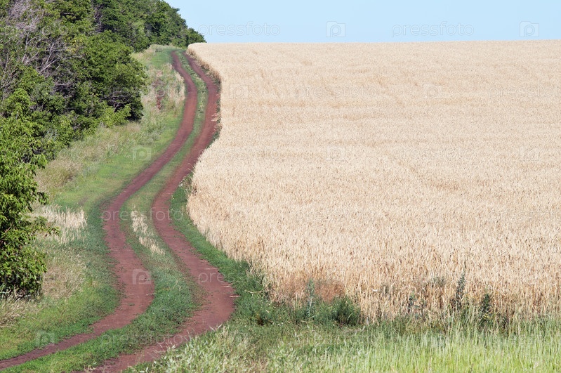 Проселочная дорога вдоль поля пшеницы