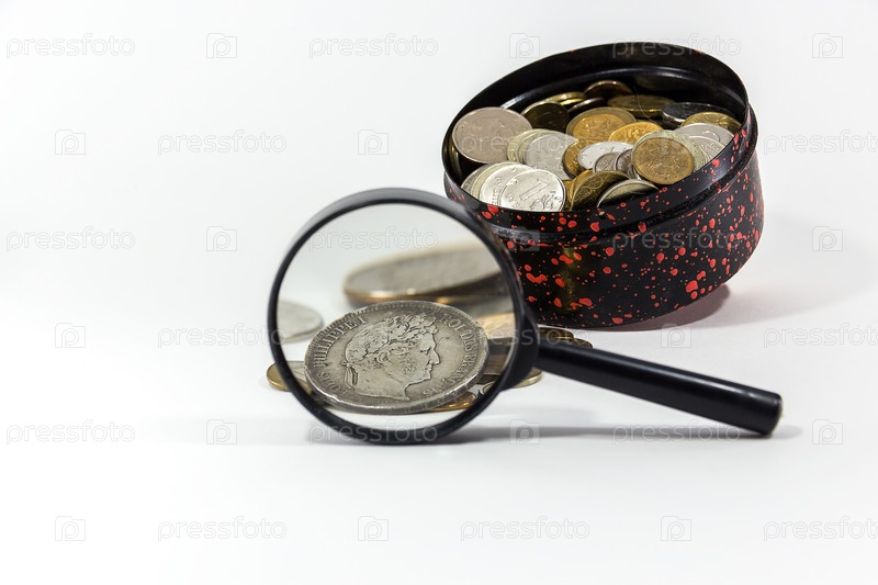 Серебряная монета под увеличительным стеклом