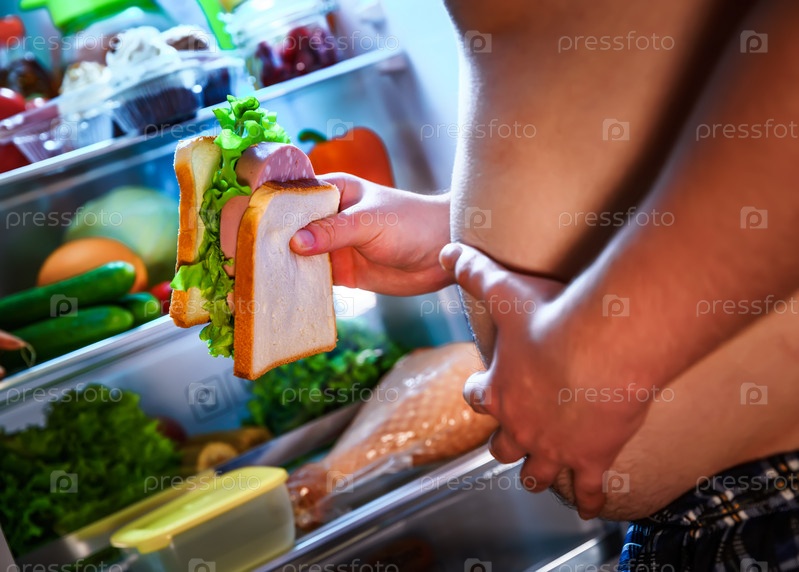 Голодный человек с бутербродом рядом с открытым холодильником