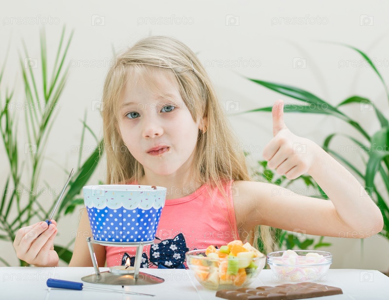 Ребенок готовит шоколадное фондю с кусочками фруктов