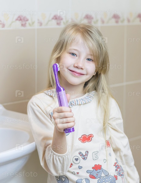 Девочка держит электрическую зубную щетку в руке