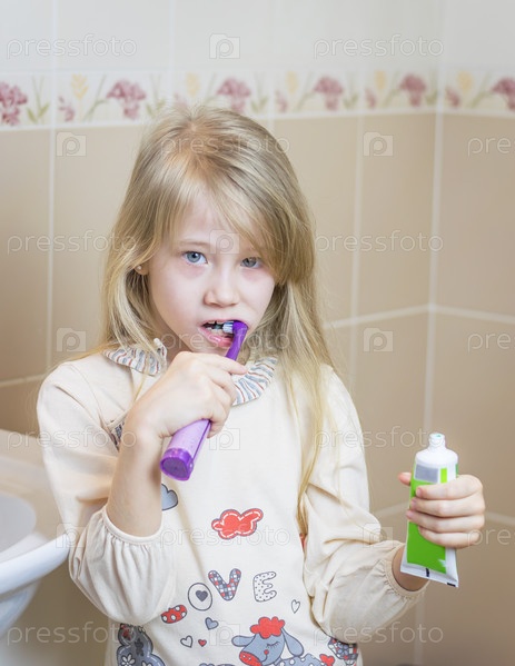 Девочка чистит зубы и держит в руках зубную пасту