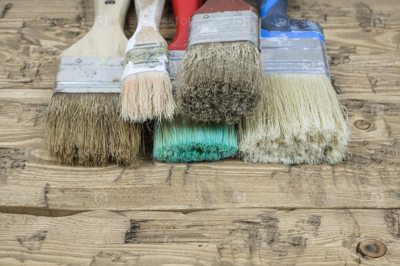 Набор использованных разноцветных кистей на деревянном столе