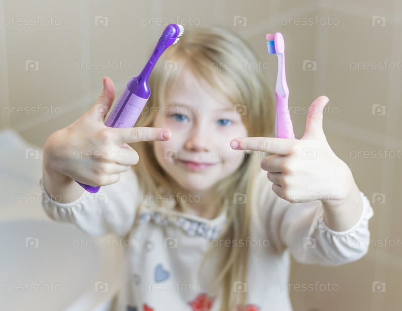 Девочка держит в руках две разные зубные щетки