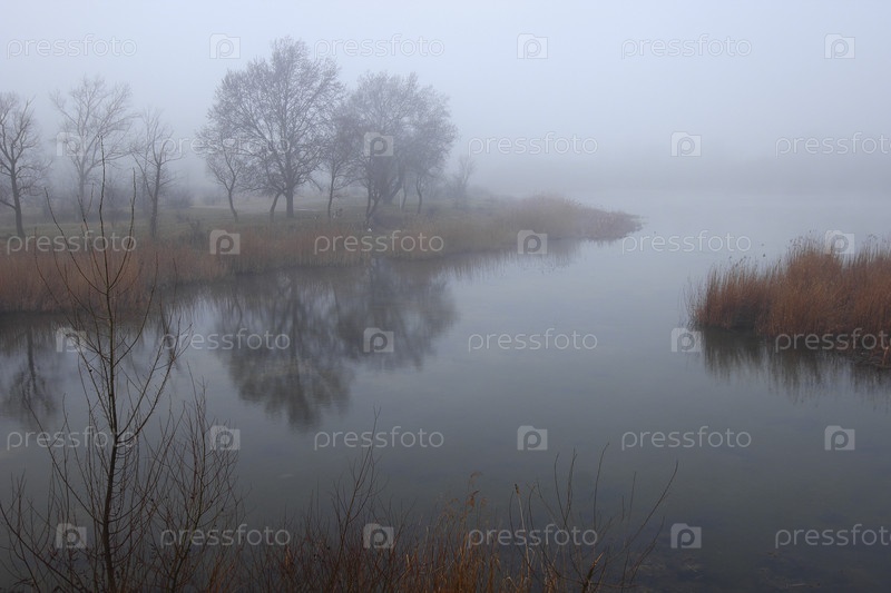Тихое озеро в тумане раннего утра