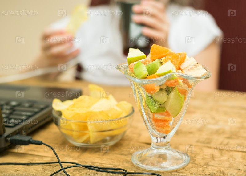 Фруктовый салат и картофельные чипсы