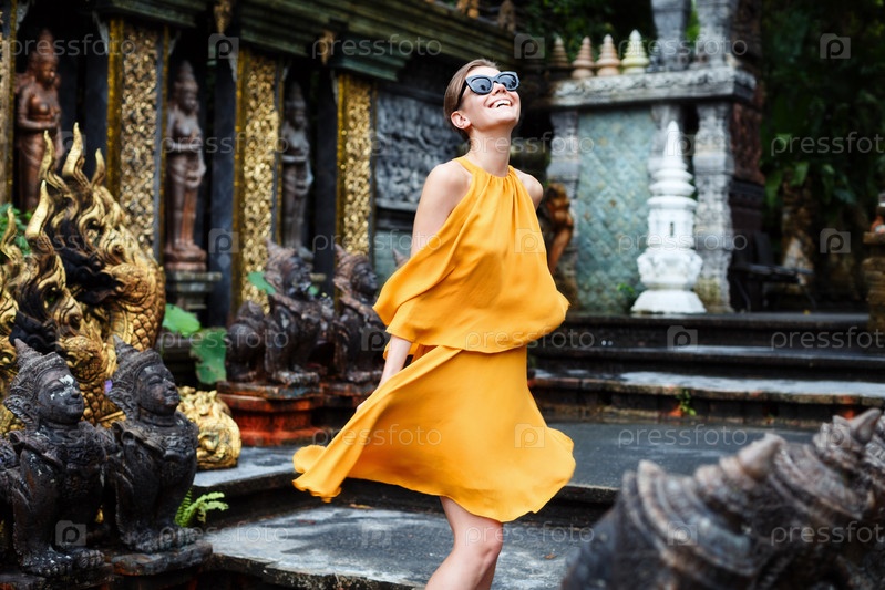 Красивая девушка позирует в храме в джунглях