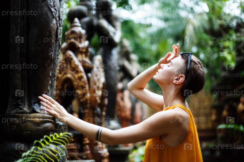 Красивая девушка позирует в храме в джунглях