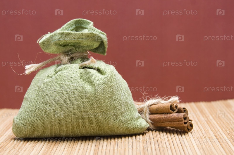Зеленый мешочек на бамбуковой поверхности