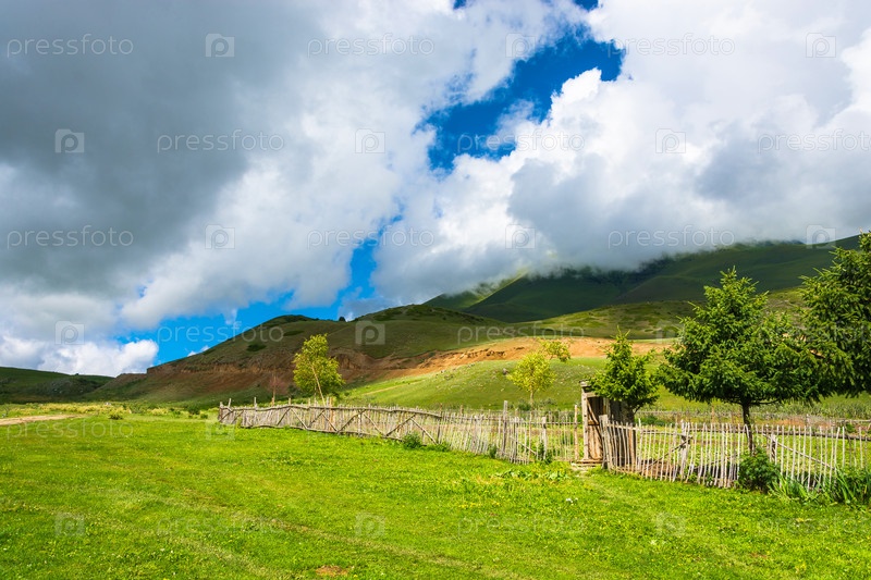 Горный пейзаж с деревянным забором, Кыргызстан