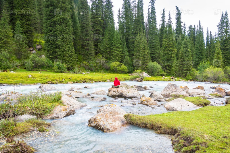 Мужчина медитирует у горной реки