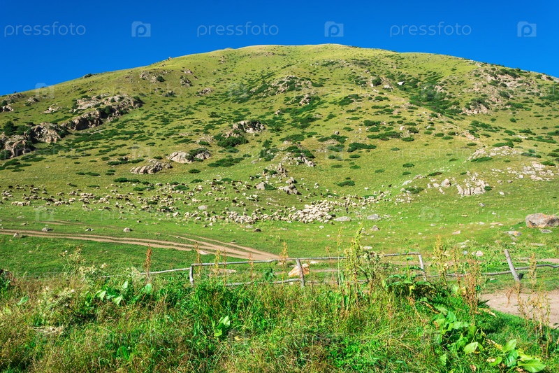 Большое стадо овец на склоне холма, Кыргызстан