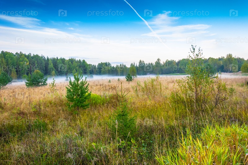 Белый туман над оранжевым полем