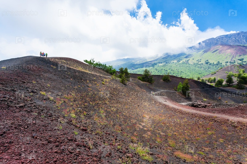 Туристы ходят по хребту между старым кратером